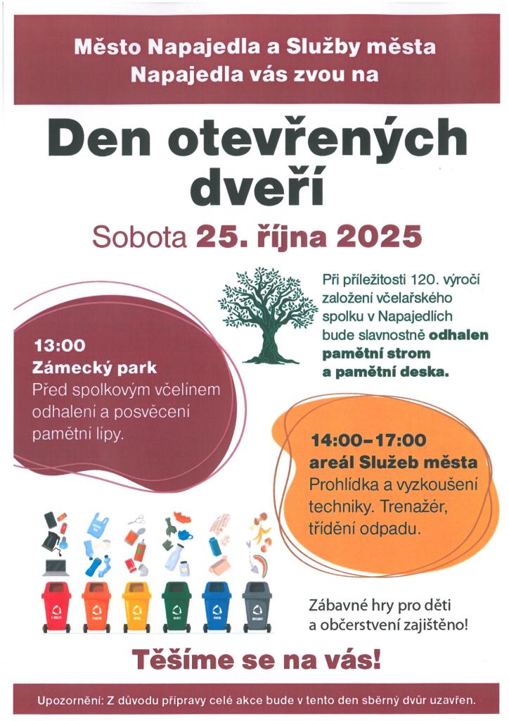 Od 14:00 do 17:00 hodin můžete navštívit areál Služeb města Napajedla, kde se koná Den otevřených dveří. Návštěvníci se mohou seznámit s technikou (např. zametačem nebo pracovní plošinou), nahlédnout do dílen a děti si mohou vyzkoušet drobné úkoly na jednotlivých stanovištích. Za jejich splnění je na závěr čeká malá odměna.